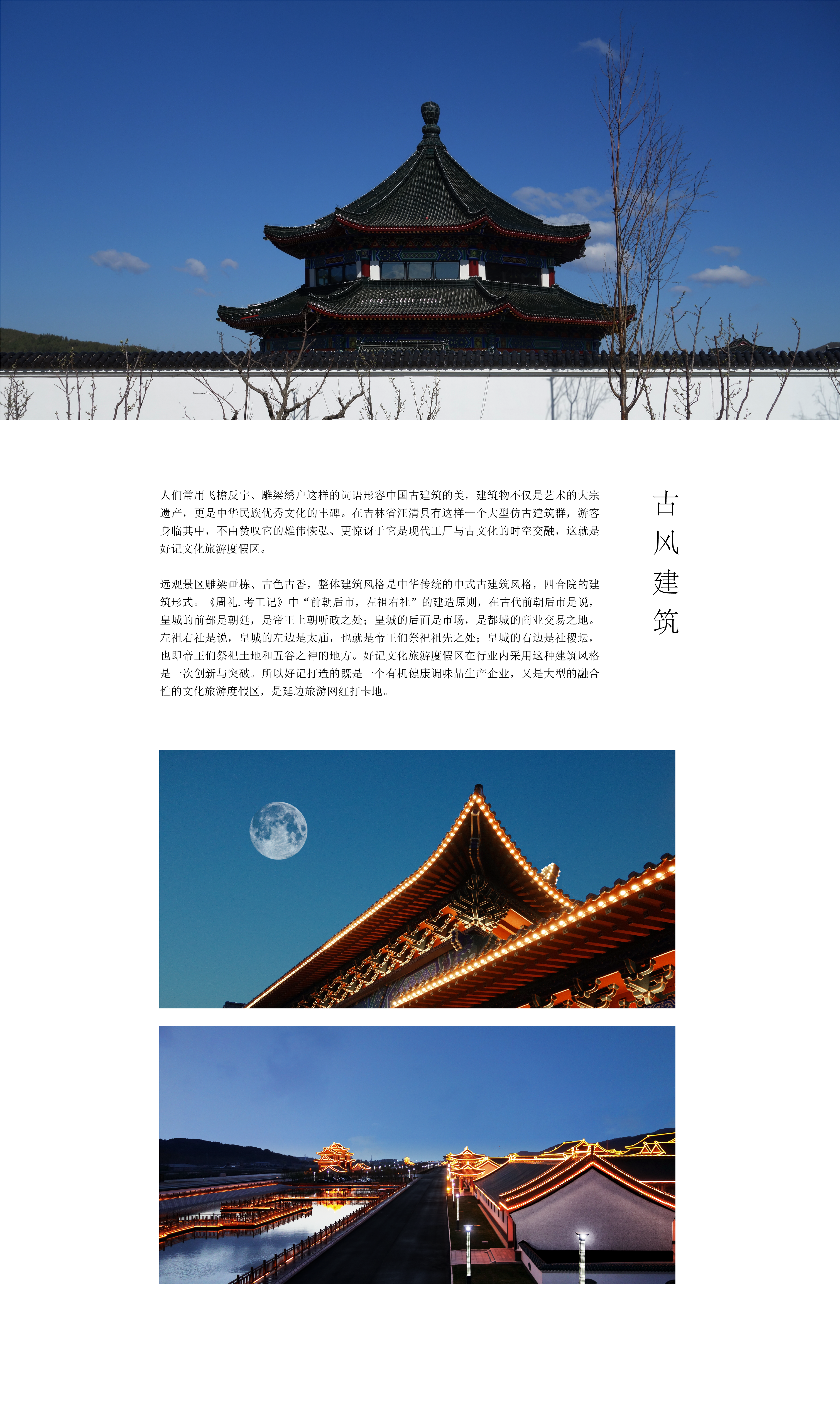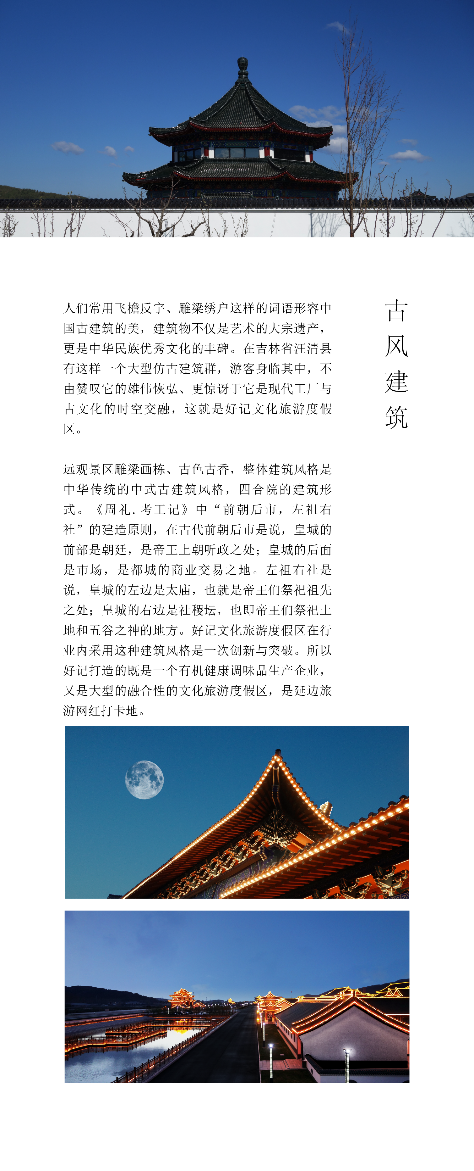 人们常用飞檐反宇、雕梁绣户这样的词语形容中国古建筑的美,建筑物不仅是艺术的大宗遗产,更是中华民族优秀文化的丰碑。在吉林省汪清县有这样一个大型仿古建筑群,游客身临其中,不由赞叹它的雄伟恢弘、更惊讶于它是现代工厂与古文化的时空交融,这就是好记文化旅游度假区。